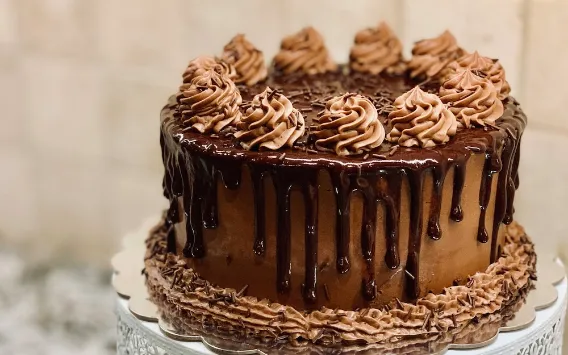 リッチなチョコレートスポンジに濃厚なチョコレートクリーム、ダークなガナッシュでコーティングし、チョコレートクリームで美しくデコレーションした贅沢なケーキ。