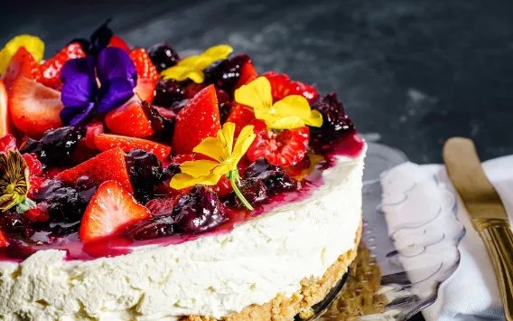 濃厚なチーズケーキに、甘酸っぱいベリーが彩りを添え、鮮やかな花が華やかさを演出。美味しさと美しさが融合した贅沢な一品。