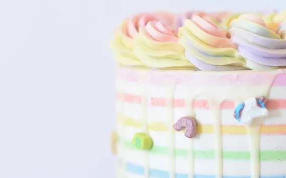 7つのパステルカラーで積み重ねられたスポンジと、優しい色味の生クリームが織り成す、美しい層のケーキ。色彩の豊かさと、口溶けの良さが魅力。
