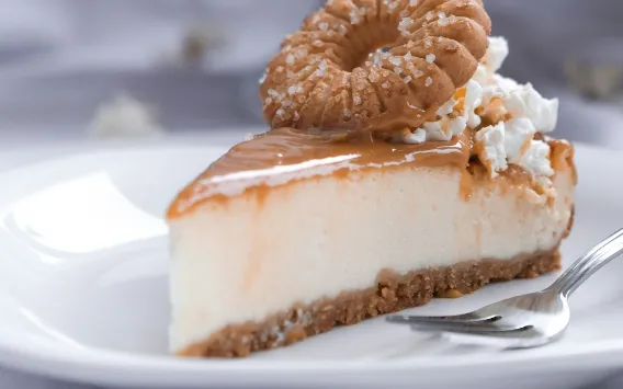 キャラメルでコーティングされたムースタルトには、幸せのオーラが漂う。香ばしいクッキーがその幸福を増大させ、口いっぱいに上品な味わいが広がる。