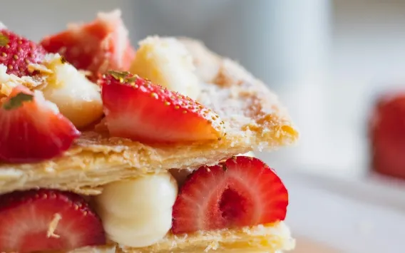 いちごの華やかな味わいが詰まった、サクサクのパイ生地と濃厚なクリームのハーモニーを奏でるミルフィーユ。至福の時を奏でられる。